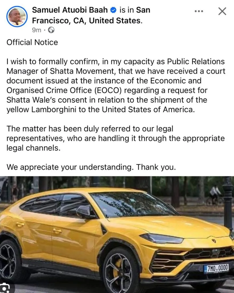 Sammy Flex stated in his caption that “I wish to formally confirm, in my capacity as Public Relations Manager of Shatta Movement, that we have received a court document issued at the instance of EOCO regarding a request for Shatta Wale’s consent in relation to the shipment of the yellow Lamborghini to the United States of America”.